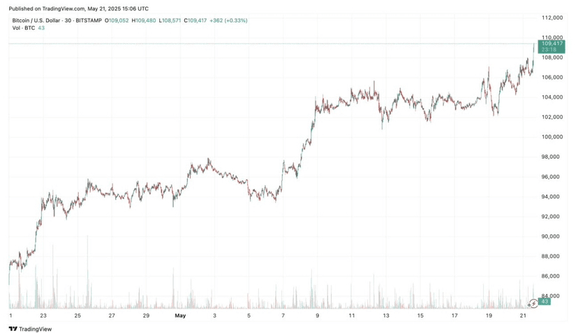 Pada 21/5/2025, pasar crypto meledak ketika Bitcoin (BTC) secara resmi mencetak puncak baru di level 109.545 USD, melampaui level tinggi sebelumnya 109.114 USD yang ditetapkan awal tahun ini. Ini adalah tanda bahwa pasar sedang bereaksi kuat terhadap serangkaian sinyal positif dari politik internasional maupun kerangka hukum di dalam negeri AS.