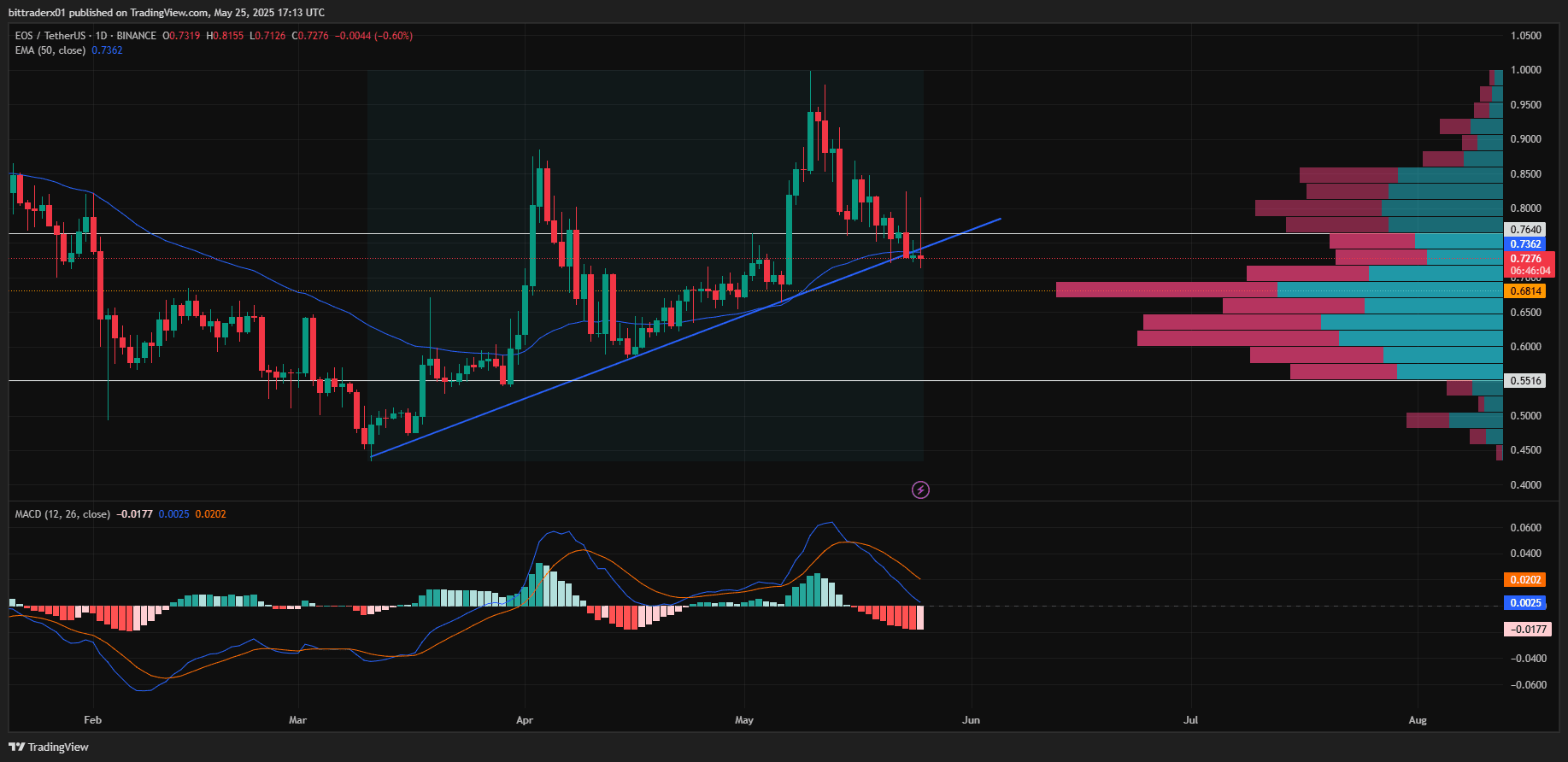 $EOS menunjukkan tanda-tanda kelemahan yang jelas setelah turun dari saluran tren naiknya, menandakan pergeseran bearish tepat sebelum pembukaan mingguan yang baru. Harga saat ini diperdagangkan di bawah baik Area Nilai Tinggi (VAH) dan EMA 50-hari, memperkuat tekanan ke bawah. Selain itu, indikator MACD menunjukkan momentum bearish, menunjukkan kemungkinan kerugian lebih lanjut di depan. Jika pasar yang lebih luas mengalami sedikit penarikan, EOS kemungkinan besar akan mengunjungi Titik Kontrol (POC) di $0.683 pada grafik harian. Mengingat penurunan teknis dan struktur pasar, posisi pendek pada EOS tampaknya menjadi pengaturan yang lebih menguntungkan dalam jangka pendek.