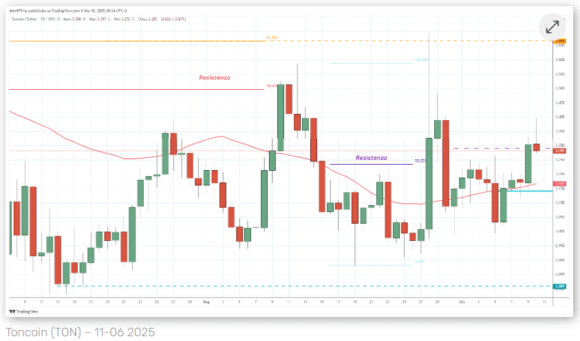 Harga Toncoin (TON) berada dalam fase tren yang umumnya bullish. Harga TON tercatat di $3.24 dan di grafik harian Anda dapat melihat fase ayunan dari bulan lalu. Namun, ia mencatat serangkaian puncak yang semakin tinggi. Di bulan Juni, ia mencatat +4.20% sementara sejak awal tahun rsso adalah 40%.