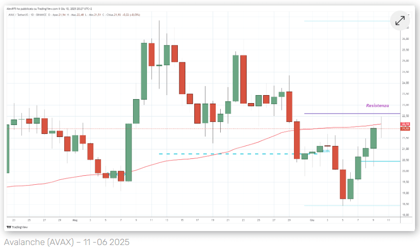Sejak awal 2025, Avalanche telah mencatat penurunan 38%, yang menempatkannya di antara cryptocurrency terburuk di Top 20. Fase bearish ini dapat diamati di grafik harian. Pada awal Juni, AVAX melanggar dukungan di area $20.70 dan mencatat minimum di $18.50 dari mana ia memantul.