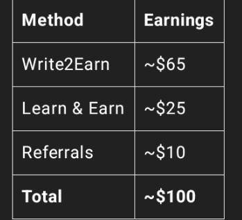 MetodePendapatanWrite2Earn~$65Belajar & Dapatkan~$25Referensi~$10Total~$100