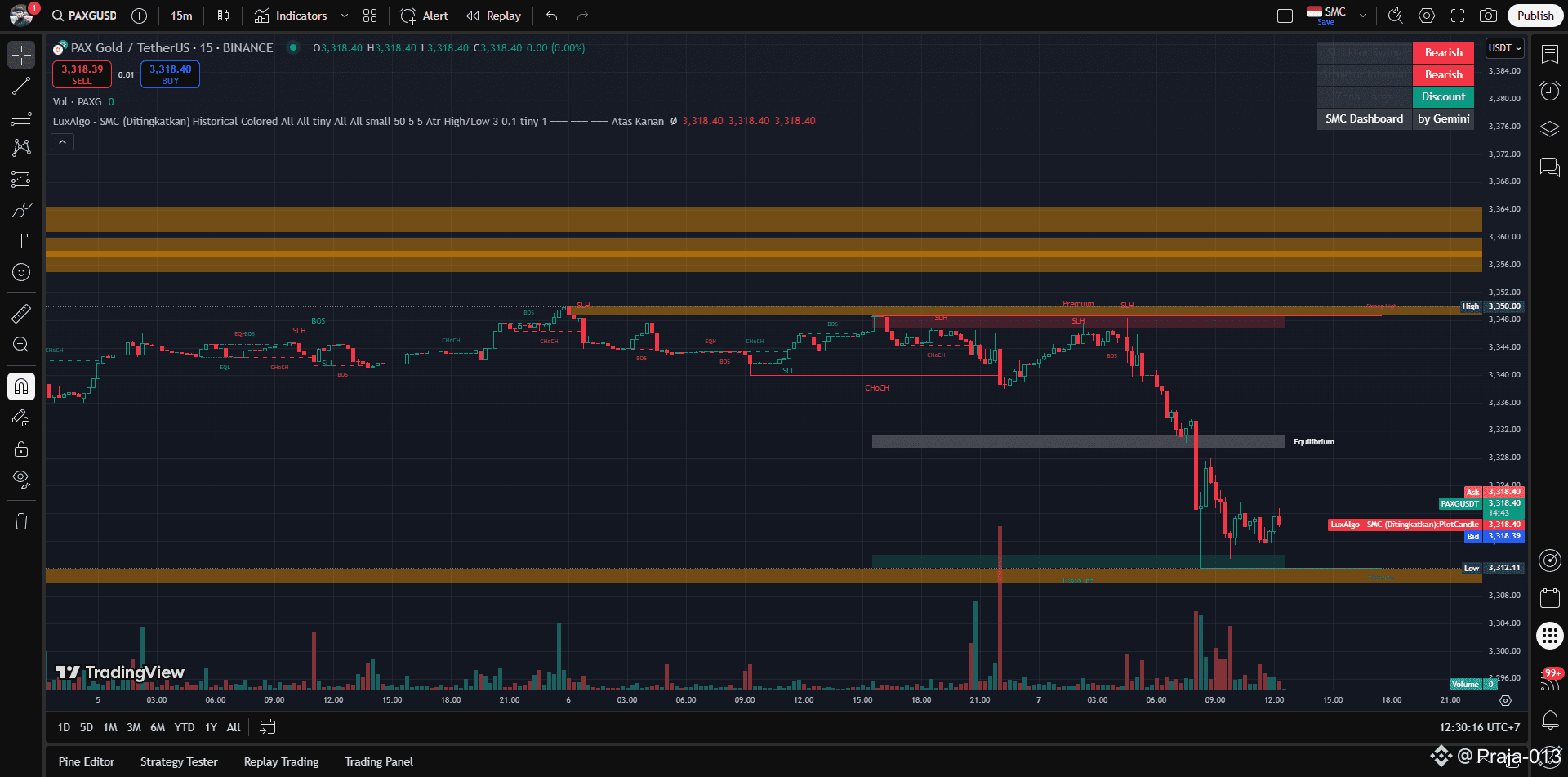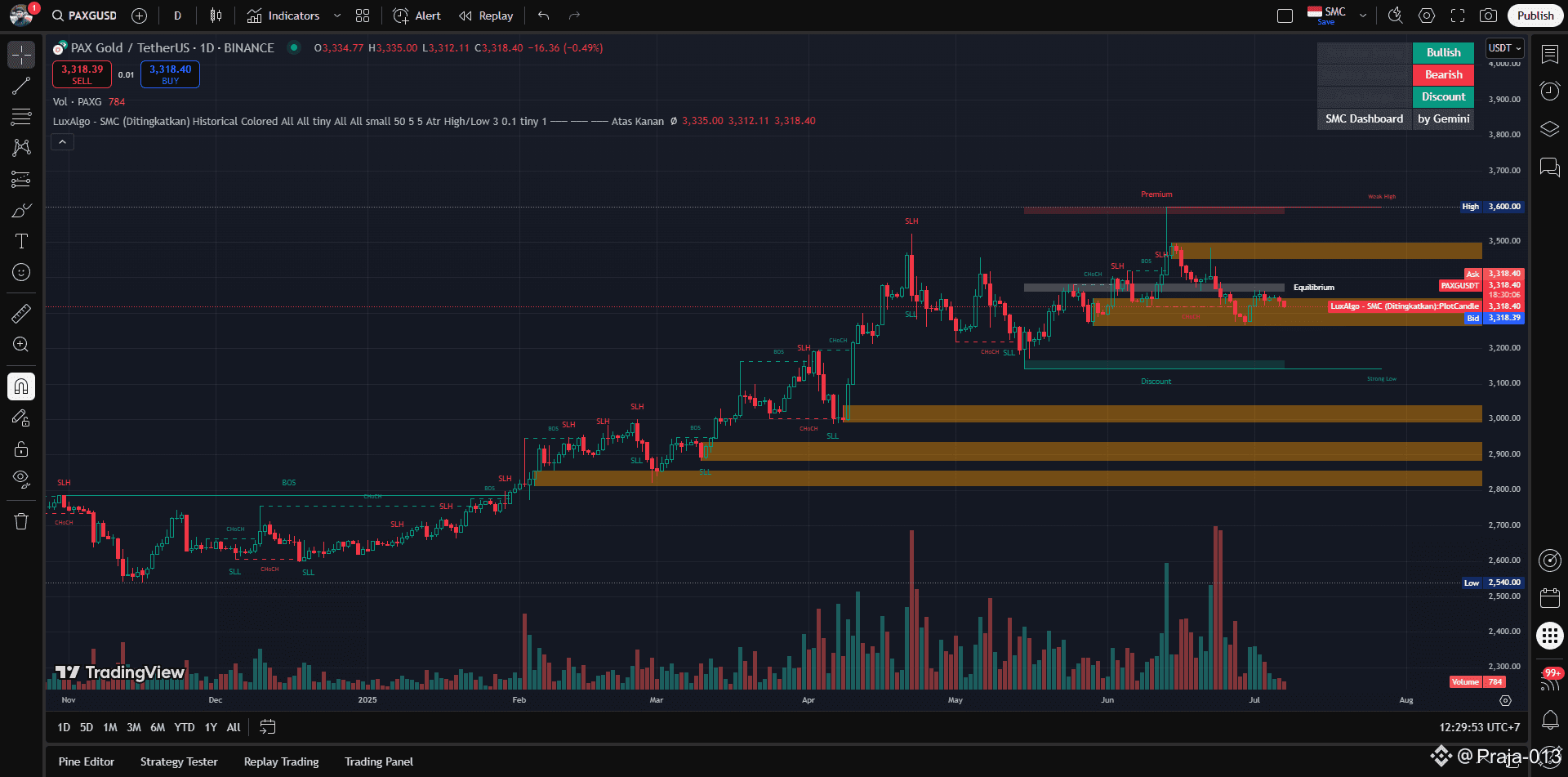 Saat ini, $PAXG diperdagangkan di sekitar $3,118.40 USDT. Dari dasbor SMC, bias tren jangka panjang (D1) menunjukkan Bullish momentum, namun di timeframe jangka pendek (H4/M15), biasnya cenderung Bearish. Ini mengindikasikan adanya perebutan kekuatan antara pembeli dan penjual!