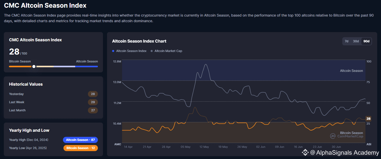 Berdasarkan data tanggal 12 Juli 2025, pasar cryptocurrency saat ini berada dalam Musim Bitcoin. Indeks Musim Altcoin CMC yang rendah secara konsisten (28/100) dan tren historis jangka pendek menunjukkan bahwa Bitcoin telah mendominasi kinerja pasar selama beberapa waktu terakhir. Meskipun ada periode Musim Altcoin di akhir tahun 2024, kondisi saat ini menunjukkan pergeseran kembali ke dominasi Bitcoin.