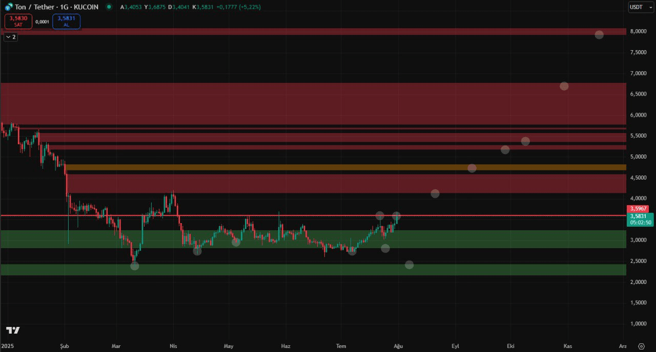 Jika kondisi pasar tidak berubah secara signifikan dan jika penutupan harian dari $TON akan berada di atas resistance yang ditandai, maka target bullish berikutnya harus sejalan dengan zona yang disorot oranye pada grafik. Posisi ini mungkin menjadi zona likuiditas berikutnya bagi para bullish.