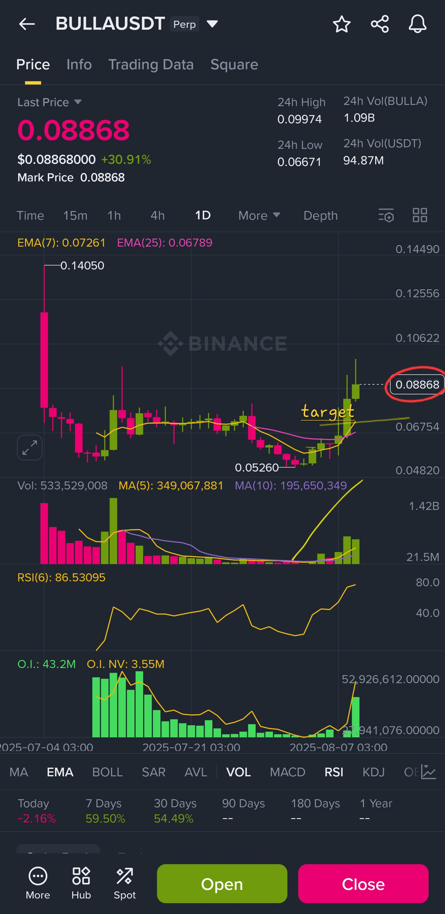 Dan kami telah merata posisi kami dan, meskipun belum mencapai target awal 0.07, kami sudah dalam posisi untung saat ini. Rata-rata harga posisi 0.0946667, harga pasar 0.08868. Kita bisa menunggu, kita bisa menutup setidaknya di titik impas atau sedikit untung dan melanjutkan.