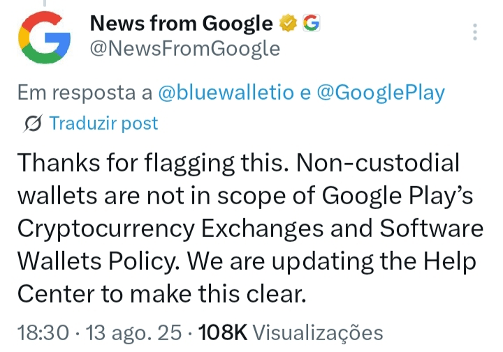 Di atas disebutkan perkiraan tentang konteks terkini: Setelah backlash, Google menjelaskan bahwa dompet tidak kustodian (self-custody) tidak memerlukan lisensi di Play Store, memperbarui Pusat Bantuan.