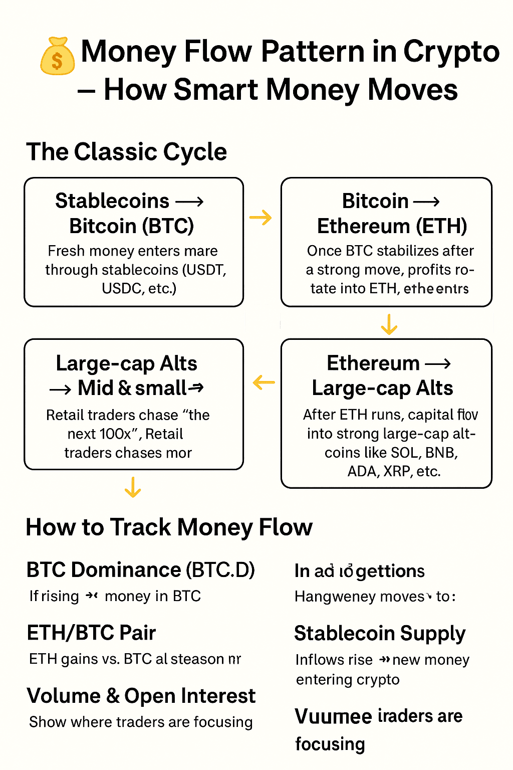 Jika Anda pernah bertanya-tanya mengapa Bitcoin naik terlebih dahulu, kemudian ETH, lalu altcoin, Anda sebenarnya memperhatikan siklus yang dikenal sebagai aliran uang dalam crypto. Memahami pola ini dapat membantu Anda berdagang lebih cerdas dan menghindari mengejar pergerakan yang terlambat.
