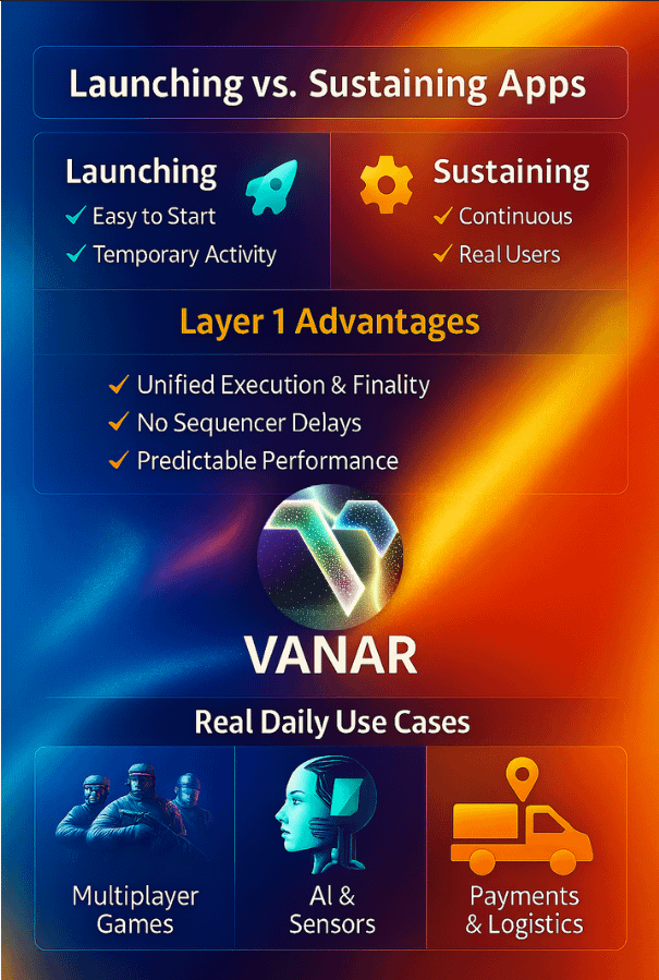 Meluncurkan aplikasi di blockchain telah menjadi lebih mudah dari sebelumnya. Layer 2 rollups dan tumpukan modular memungkinkan pengembang untuk menerapkan dengan cepat dan menunjukkan aktivitas instan. Namun, mempertahankan aplikasi adalah tantangan yang berbeda. Setelah pengguna nyata datang, lalu lintas berfluktuasi, dan sistem harus berjalan terus menerus, pilihan infrastruktur menentukan apakah sebuah aplikasi berkembang atau gagal. Kontras antara desain L2 dan L1 menjadi kritis dalam skenario ini.
