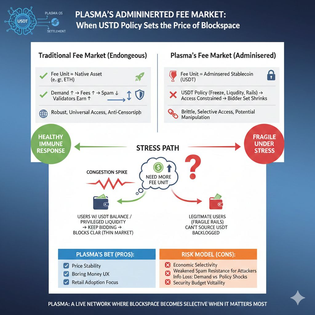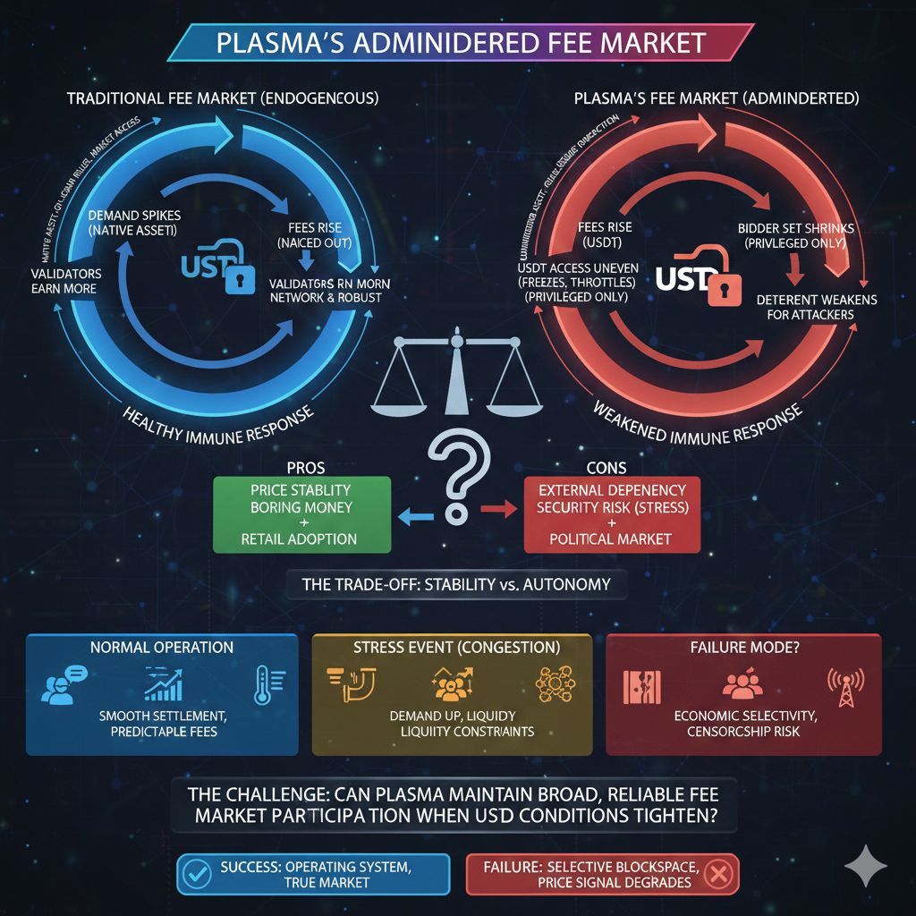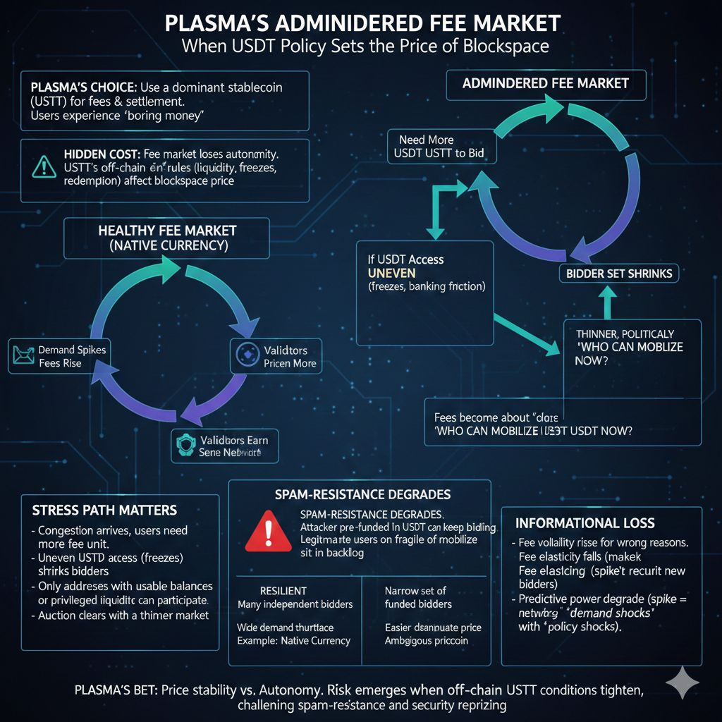 A healthy fee market is an immune response. Demand spikes, fees rise, spam gets priced out, and validators earn more to secure a busier network. That loop degrades when the bidding currency is externally administered, meaning its usability can be constrained without any vote of consensus. By “native” here I mean an asset whose availability and transferability are governed primarily by on-chain rules and market access, not by an issuer’s discretionary freeze policy or by the operational state of redemption rails. Plasma’s stablecoin-first design trades away some of that autonomy in exchange for pricing stability, and that trade becomes visible only when the network is stressed.