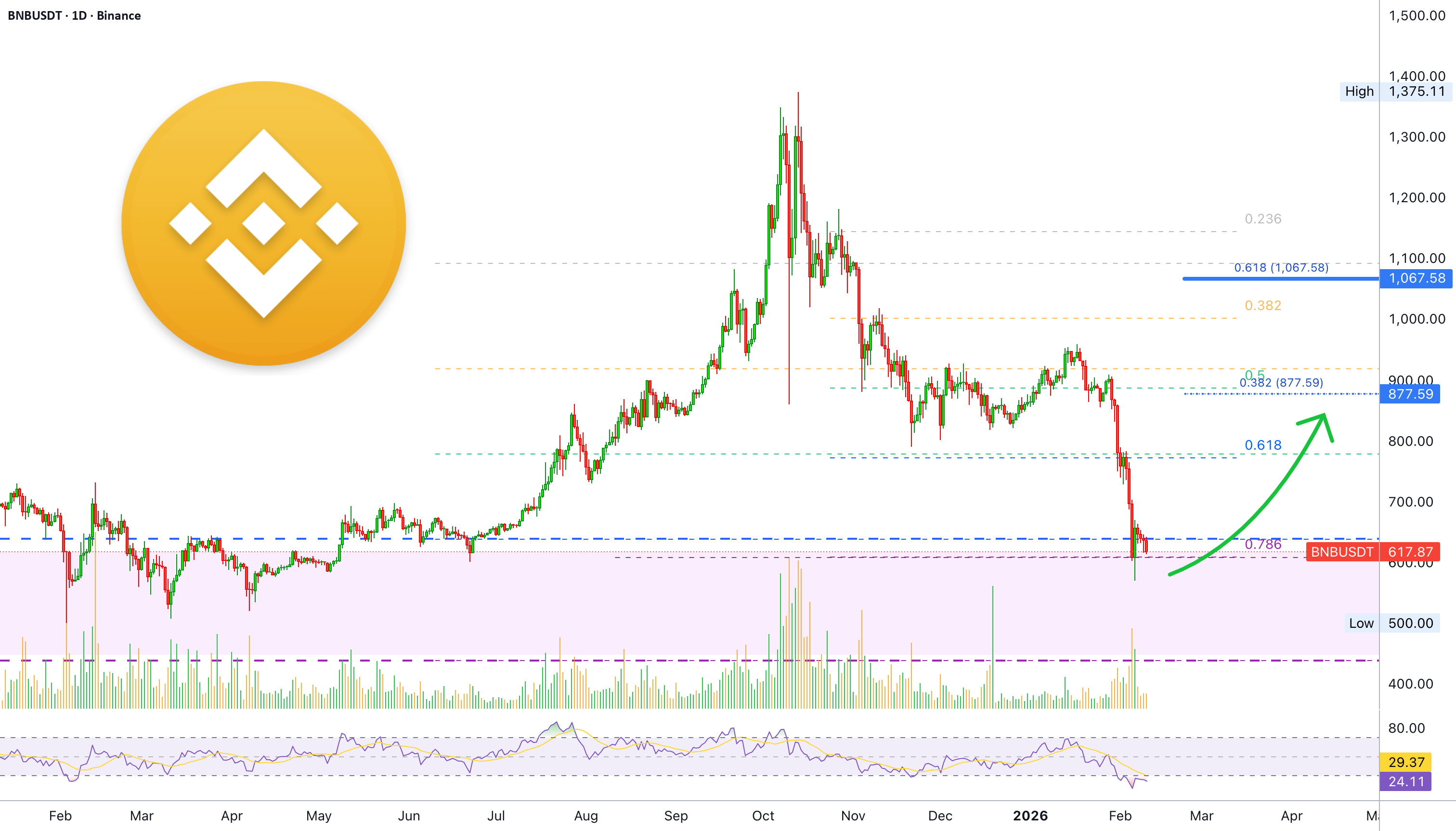›› Pada Februari 2026, tepat satu tahun kemudian, Binance Coin mencapai titik terendah di $570 dan harga penutupan candle sebelumnya adalah $608.