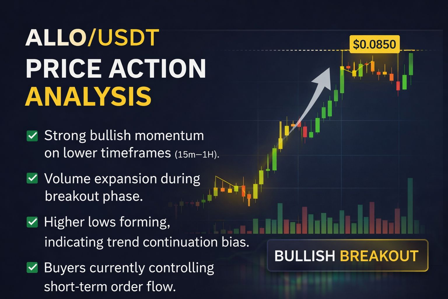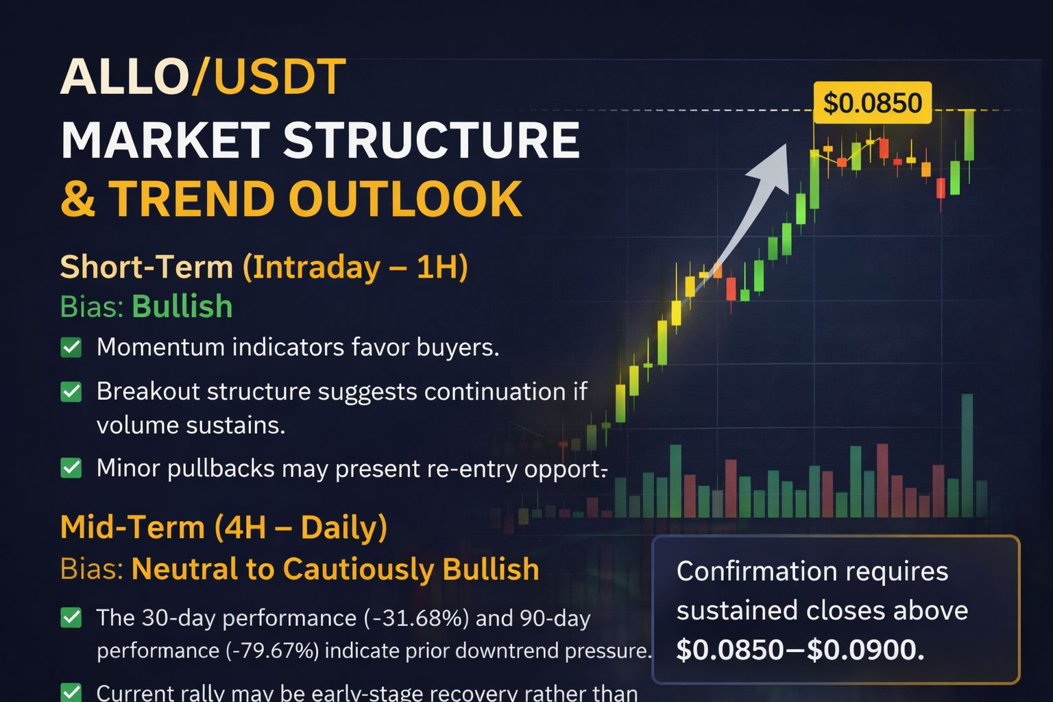 ALLO/USDT is currently exhibiting strong short-term bullish momentum backed by increased trading volume and improved order flow structure. While the immediate outlook remains positive, confirmation above the $0.0850 resistance is required for sustained upside continuation.