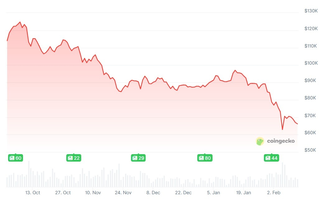 Penurunan Bitcoin tahun 2026 menarik cryptocurrency di bawah $70,000. Sumber: CoinGecko