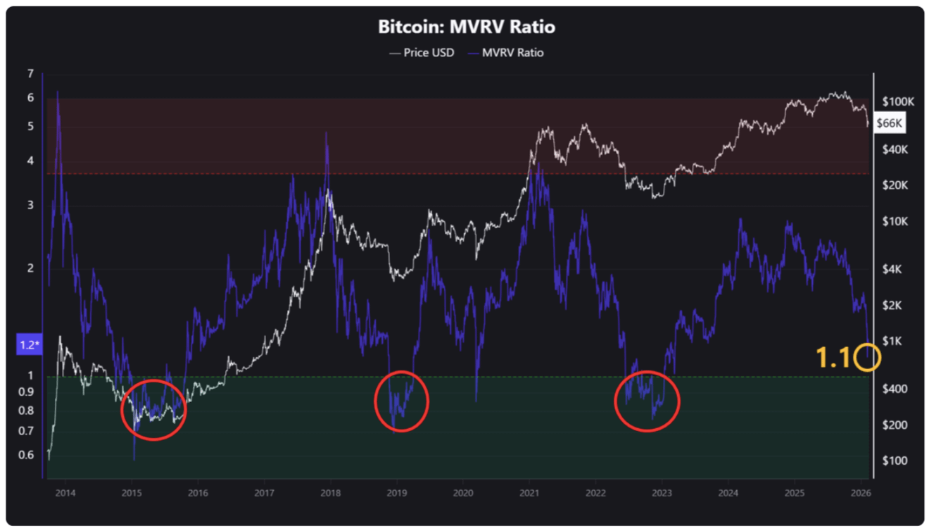 "Secara umum, ketika rasio MVRV turun di bawah 1, Bitcoin dianggap undervalued. Saat ini, indikator berdiri di sekitar 1.1, menunjukkan bahwa level harga mendekati rentang undervaluasi."