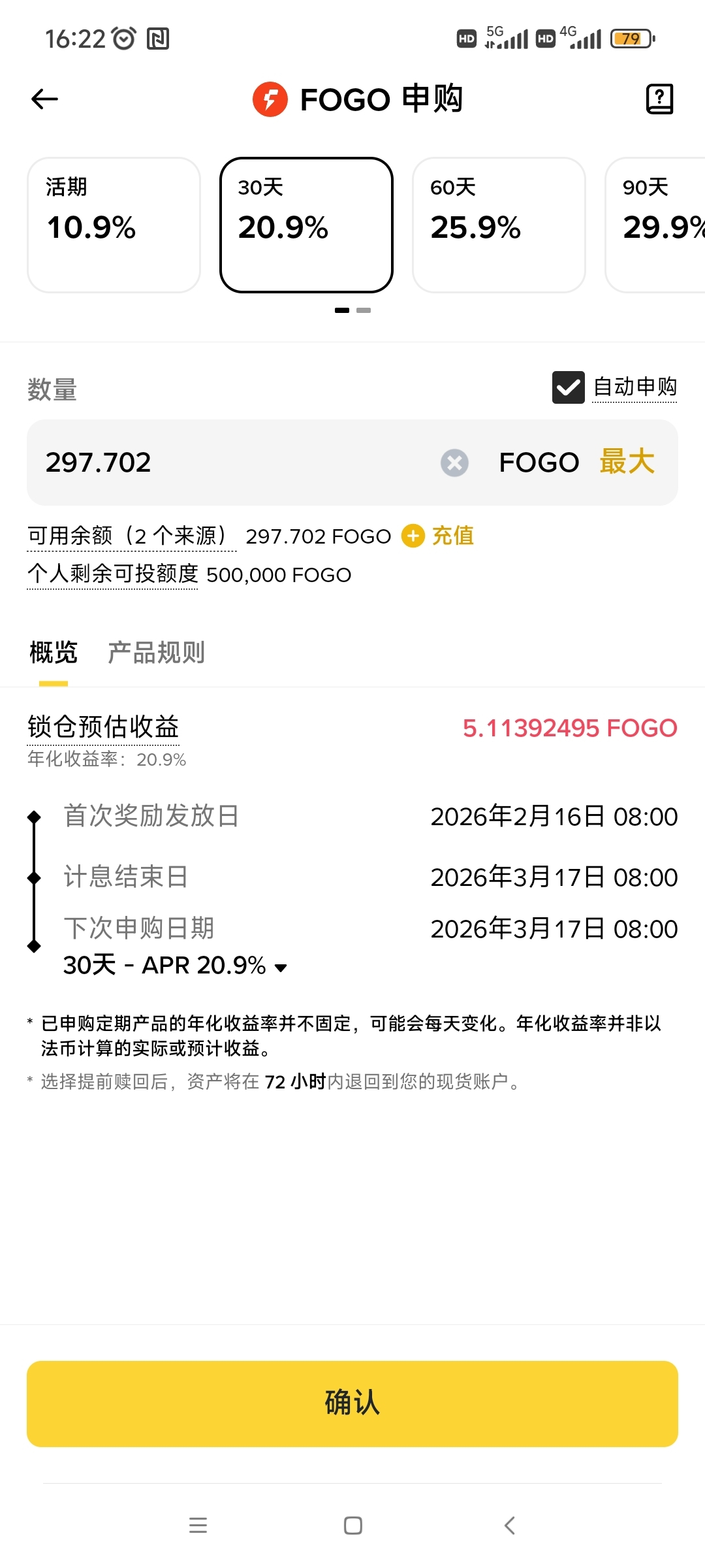 3. 将买入的FOGO,在理财板块设置30~90天定期。(我是搞了30天)