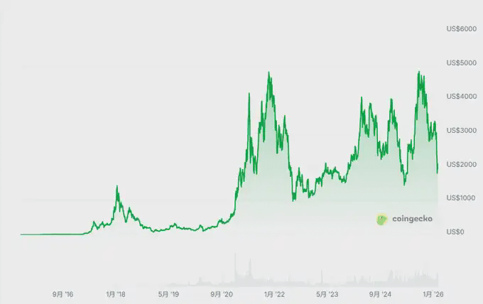 Hitung kembali dengan lebih menyentuh: pada Januari 2018, ETH pertama kali mencapai 1400 dolar AS. Itu 1400 dolar AS, jika disesuaikan dengan inflasi CPI AS, pada Februari 2026 akan setara dengan sekitar 1806 dolar AS.