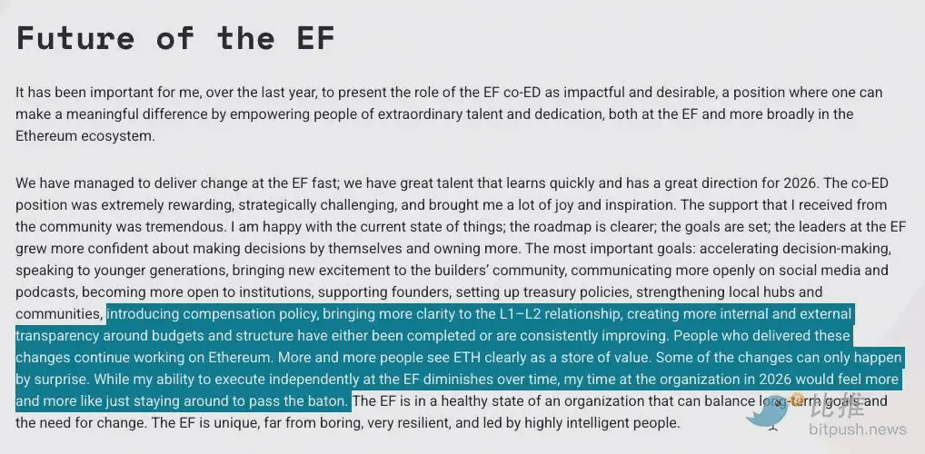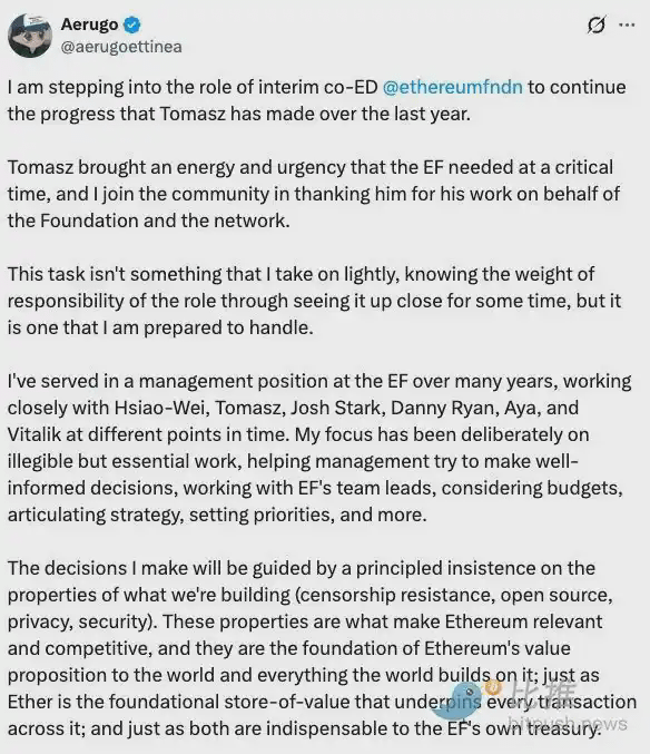 Menggantikan dia adalah Bastian Aue. Informasi publik tentang orang ini sangat sedikit, akun X terdaftar hanya delapan bulan, dan hampir tidak ada catatan pernyataan. Dia akan terus memimpin bersama Hsiao-Wei Wang organisasi yang mengendalikan sumber daya dan arah inti ekosistem Ethereum.