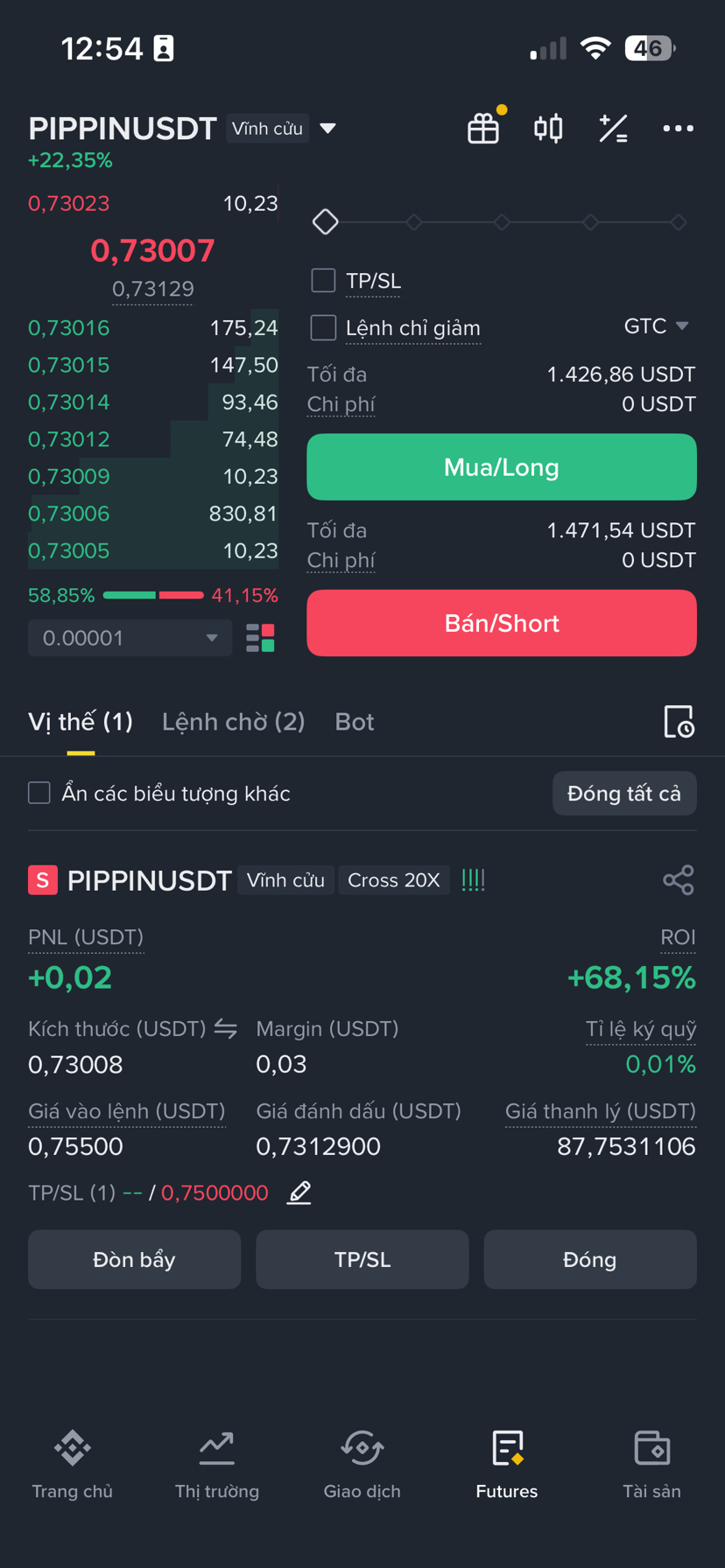 Mình short ở 0,755 đặt TP 0,73 tính cắt 50% còn lại để nó chạy. Zo nhìn lại nó cắt rồi còn để lại nhiêu đây. Hài thiệt chứ. $PIPPIN