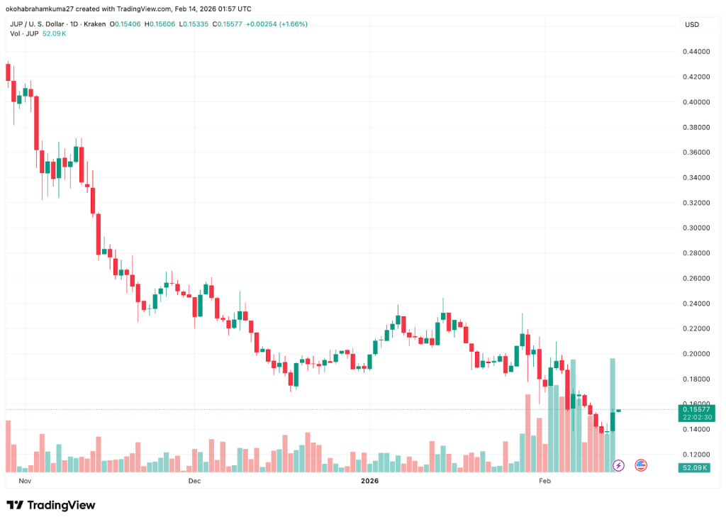 Jupiter merasakan seluruh kekuatan ketakutan ekstrem pasar. Token ini telah turun 8% dalam tujuh hari terakhir pada 13 Februari, berkinerja buruk dibandingkan pasar global. Meskipun ada perkiraan jangka panjang yang bullish yang memprediksi kenaikan hingga $0.2819 pada akhir 2026, sentimen jangka pendek sangat bearish.
