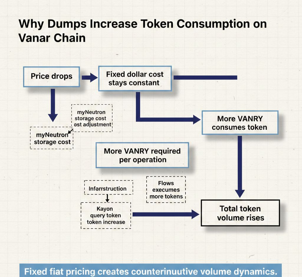 Centralized infrastructure doesn't have this dynamic. AWS charges the same dollar amount regardless of price movement. Vanar Chain's token-based fee model means infrastructure usage creates higher token volume during dumps and lower token volume during pumps, inversely correlated with what speculation does.