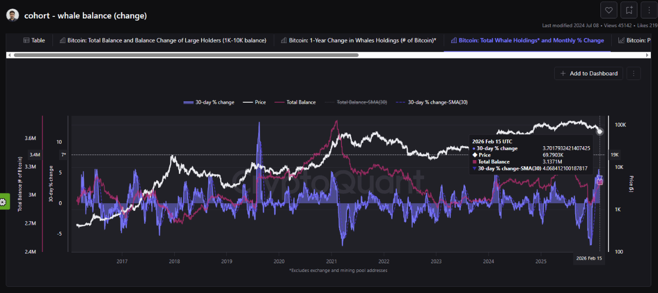 Dompet yang memegang antara 1.000 dan 10.000 BTC, yang dikenal sebagai paus, saat ini memegang 4,483M BTC per 16 Februari 2026.