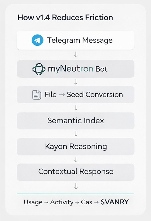 On February 9, 2026, Vanar quietly released myNeutron v1.4. At first glance, it looked like a usability update — Telegram bot integration, mobile optimization, credit tracking, file-to-Seed automation, cleaner billing. But the real shift wasn’t in the interface. It was in distribution.