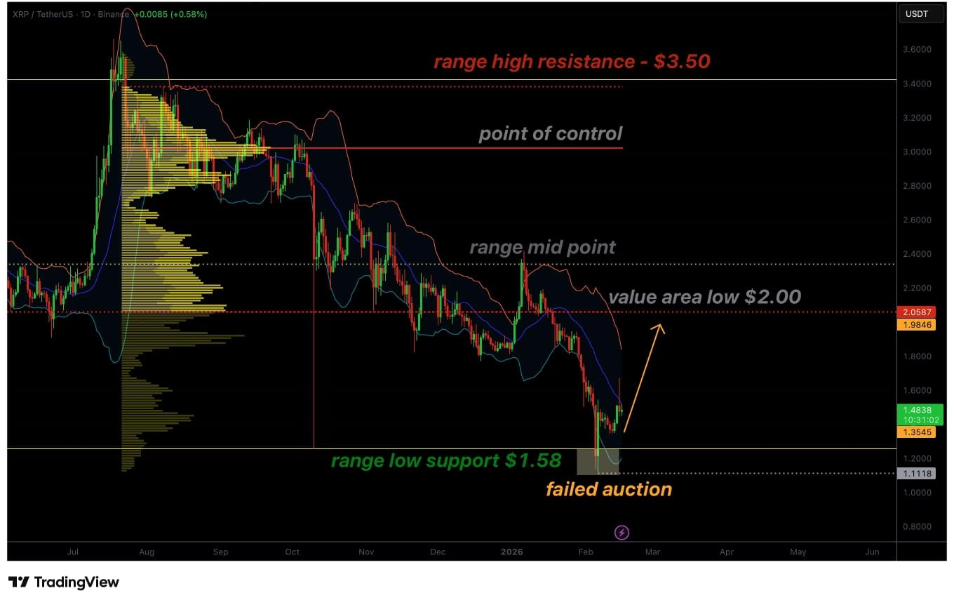 Selama aksi harga terus mempertahankan di atas batas bawah rentang $1.58, probabilitas meningkat bahwa XRP dapat berputar lebih tinggi menuju area minat utama berikutnya, yaitu batas area nilai rendah sekitar level $2.00. Dari sudut pandang struktural, ini akan mewakili gerakan pemulihan rata-rata dalam rentang yang lebih luas daripada terobosan impulsif.