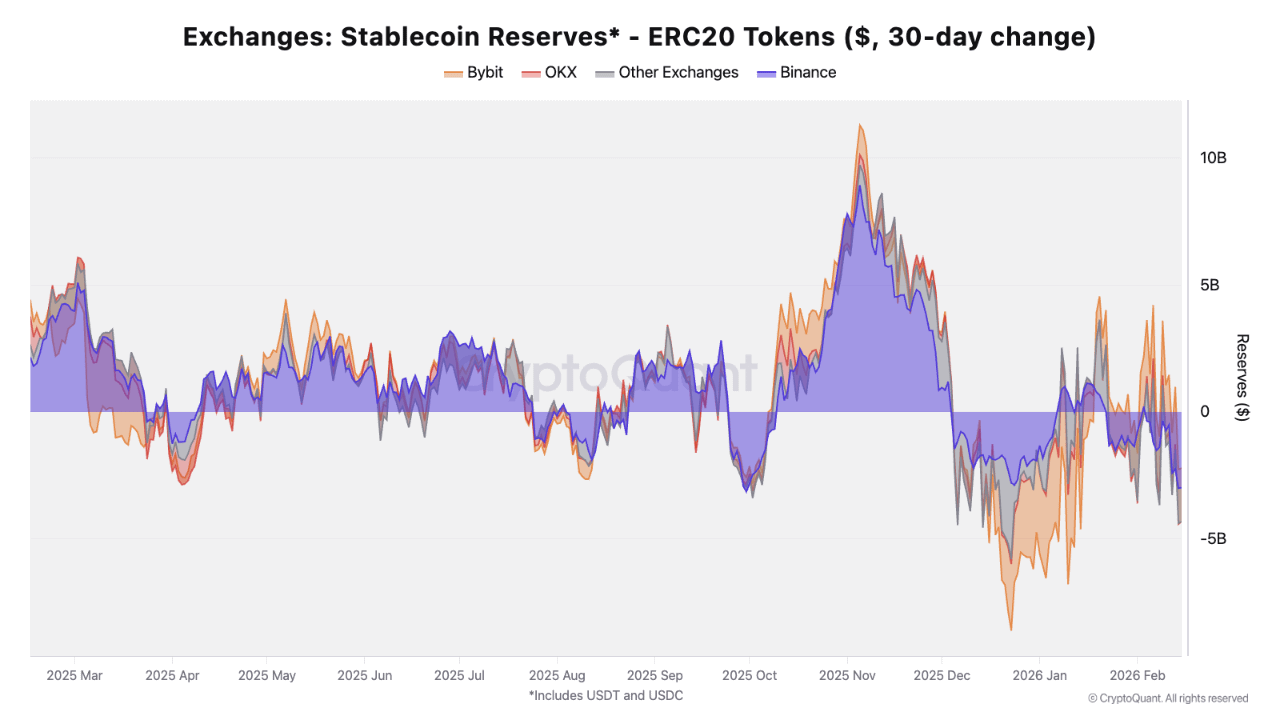 Pertumbuhan cadangan stablecoin mencapai puncaknya menjelang penurunan harga kripto akhir 2025, meningkat $11.4B dalam 30 hari hingga 5 November, sebelum menurun $8.4B pada 23 Desember di tengah awal pasar beruang. Kecepatan aliran keluar baru-baru ini telah moderat, dengan cadangan turun hanya $2B selama sebulan terakhir.
