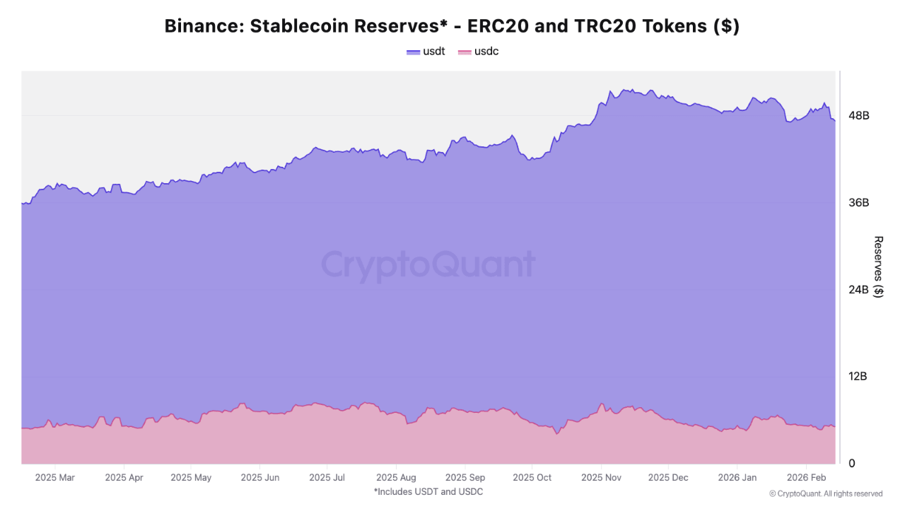 Likuiditas stablecoin Binance didominasi oleh USDT, dengan $42.3B dalam USDT (naik 36% YoY dari $31.0B) dibandingkan dengan $5.2B dalam USDC, yang tetap relatif datar dari tahun ke tahun.