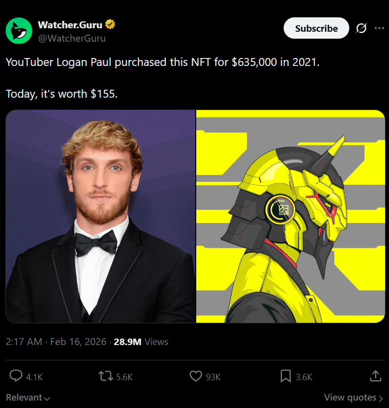 During the 2021 NFT market peak, Logan Paul bought an NFT from the 0N1 Force collection for around $635,000. At the peak of the bull market, such purchases were considered digital status symbols and long-term cultural assets.