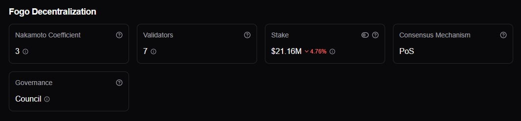 Here’s where trade-offs emerge. $FOGO currently has 7 validators and a Nakamoto Coefficient of 3, meaning only three entities would need to collude to halt or compromise the network. Total stake stands at $21.16M (4.76%). While this may be typical for a young chain, decentralization depth remains limited relative to mature Layer 1s. The consensus mechanism is PoS, with governance handled by a council model — which raises important questions around long-term validator expansion and power distribution.