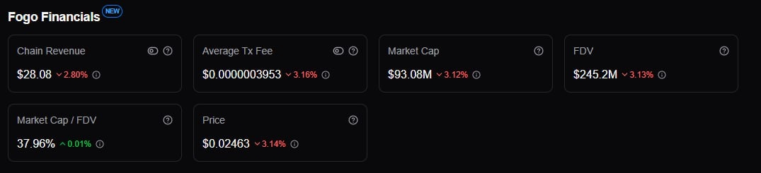 Market cap sits at $93.08M, with an FDV of $245.2M (MC/FDV: 37.96%). Average transaction fees are extremely low at $0.000000395, which supports scalability but limits fee-derived security revenue. Chain revenue currently stands at $28.08, meaning the economic security model likely relies heavily on token incentives rather than organic fee generation.