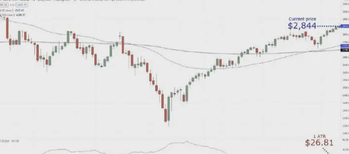 Sekarang mari kita asumsikan pasar bergerak sesuai keinginan Anda, harga saat ini adalah $2844, dan nilai ATR saat ini adalah $26,81: