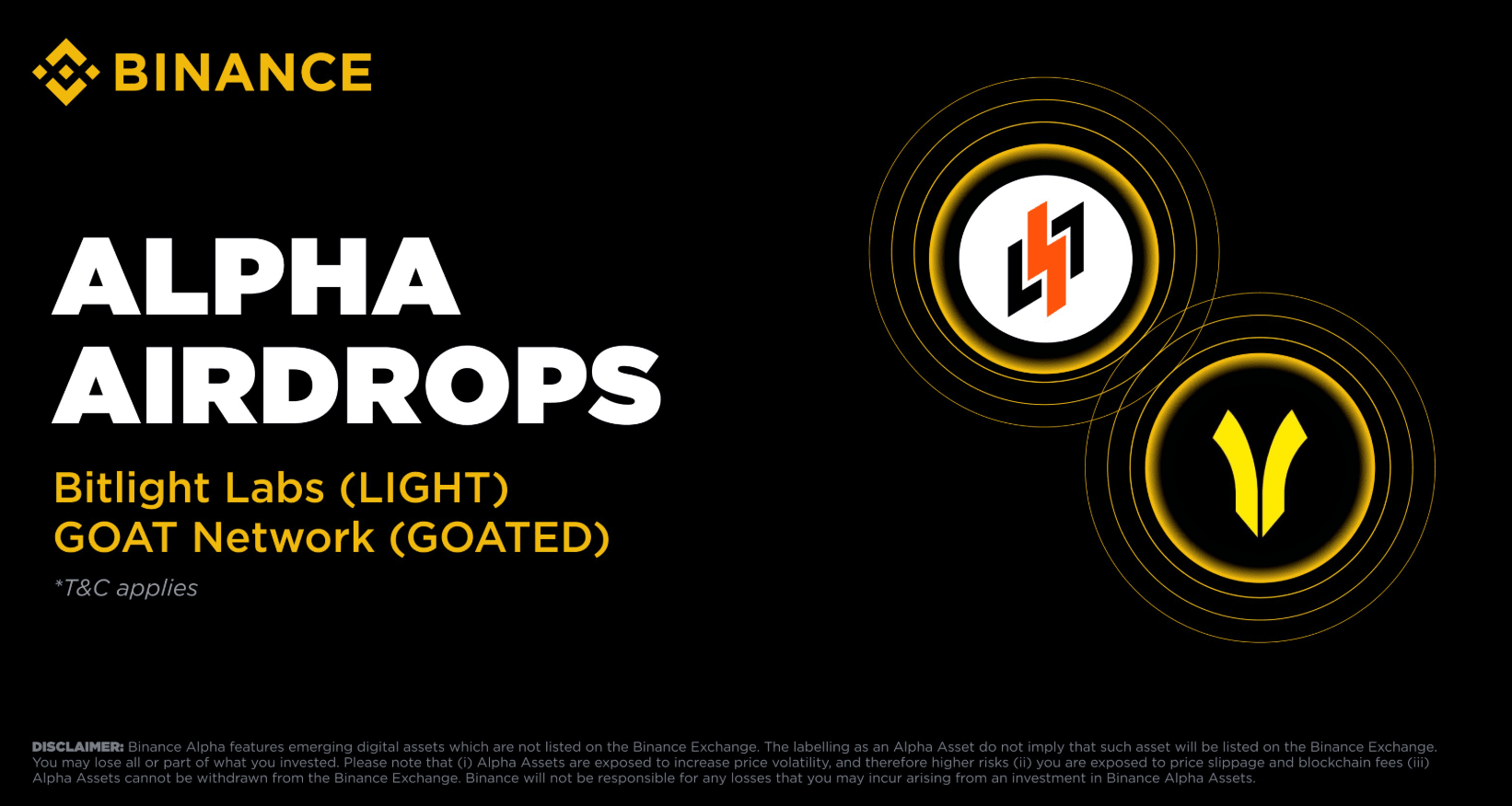 Kabar besar dari Binance Alpha: Bitlight Labs ($LIGHT) dan GOAT Network ($GOATED) akan resmi diluncurkan pada 27 September. Pengguna yang memenuhi syarat dapat mengklaim airdrop mereka menggunakan Alpha Points di halaman Acara Alpha setelah perdagangan dimulai.