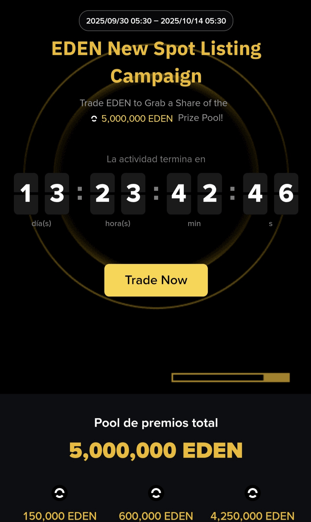 Si ya tienes tus tokens #EDEN del airdrop o planeas comprar/vender EDEN a partir de las 11:00 UTC, kampanye ini menawarkan kesempatan untuk mendapatkan token EDEN tambahan jika Anda menghasilkan volume perdagangan yang signifikan atau memenuhi tugas spesifik dari promosi.