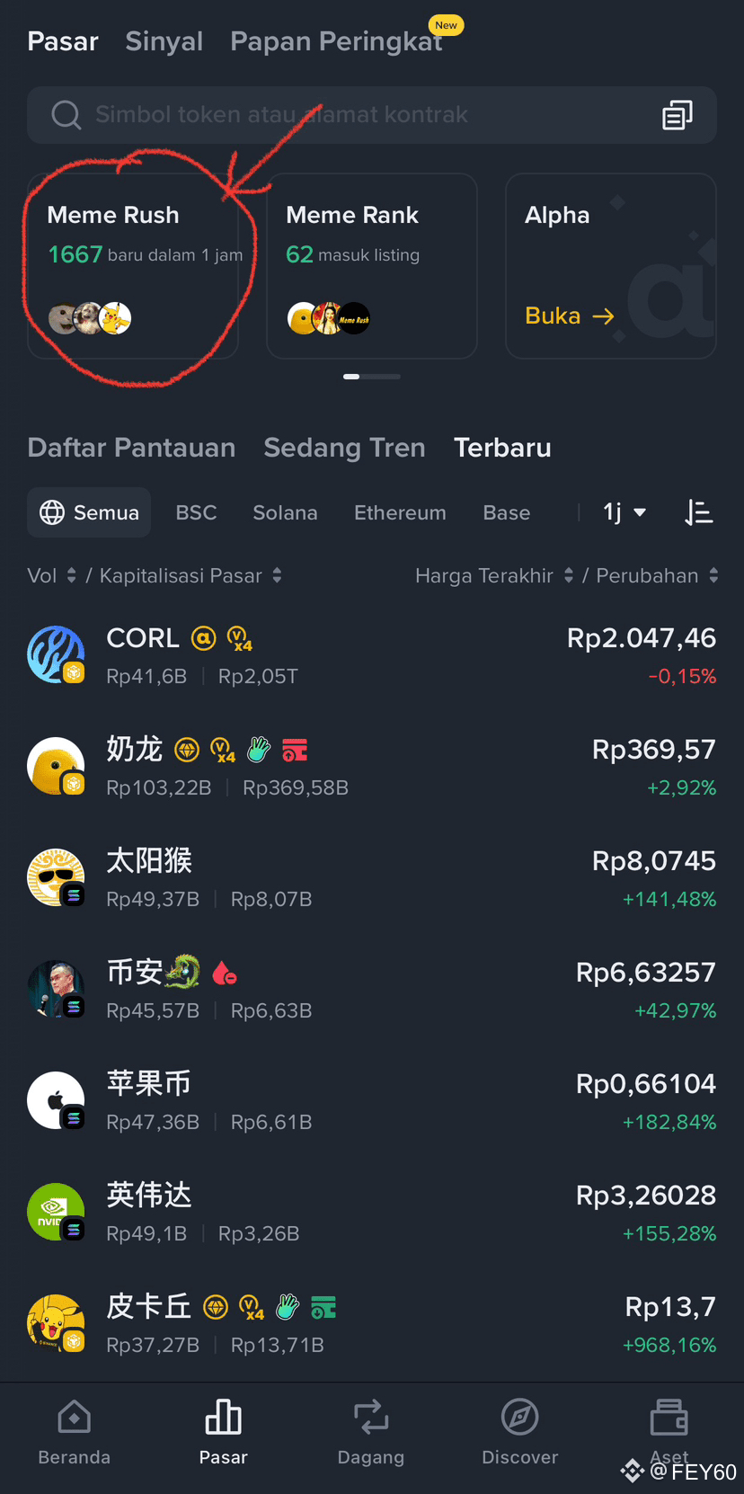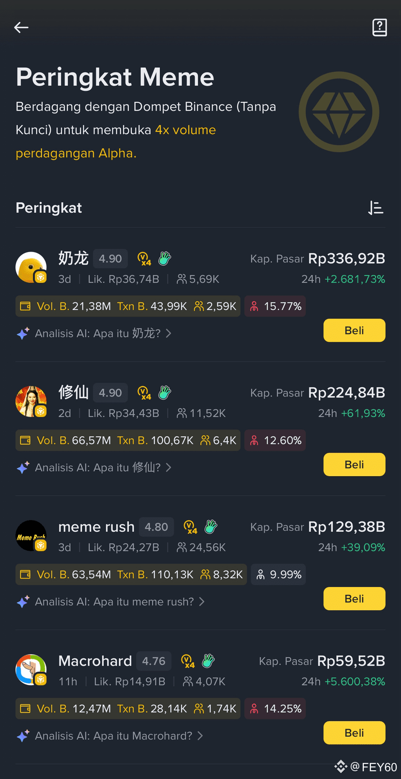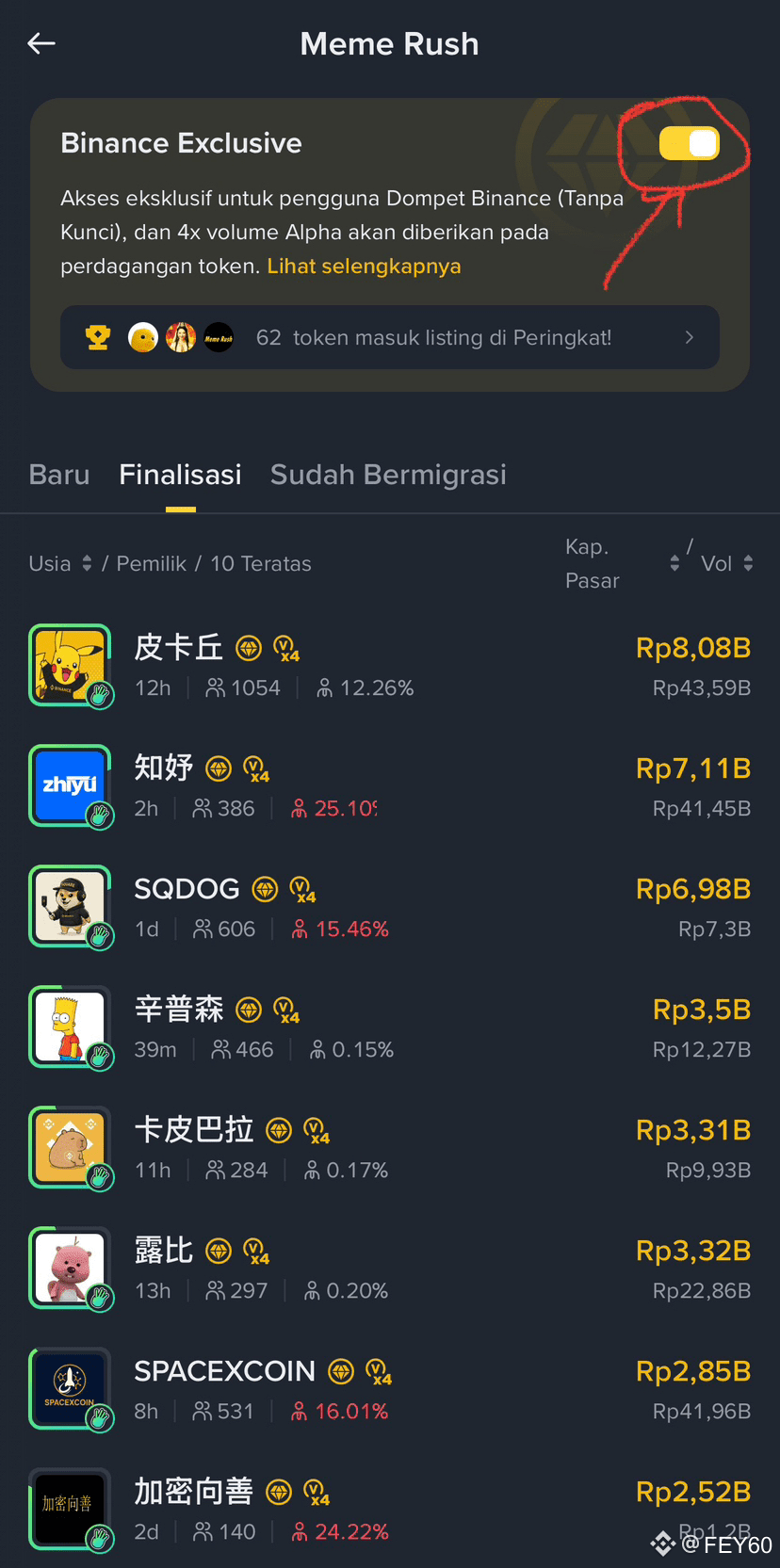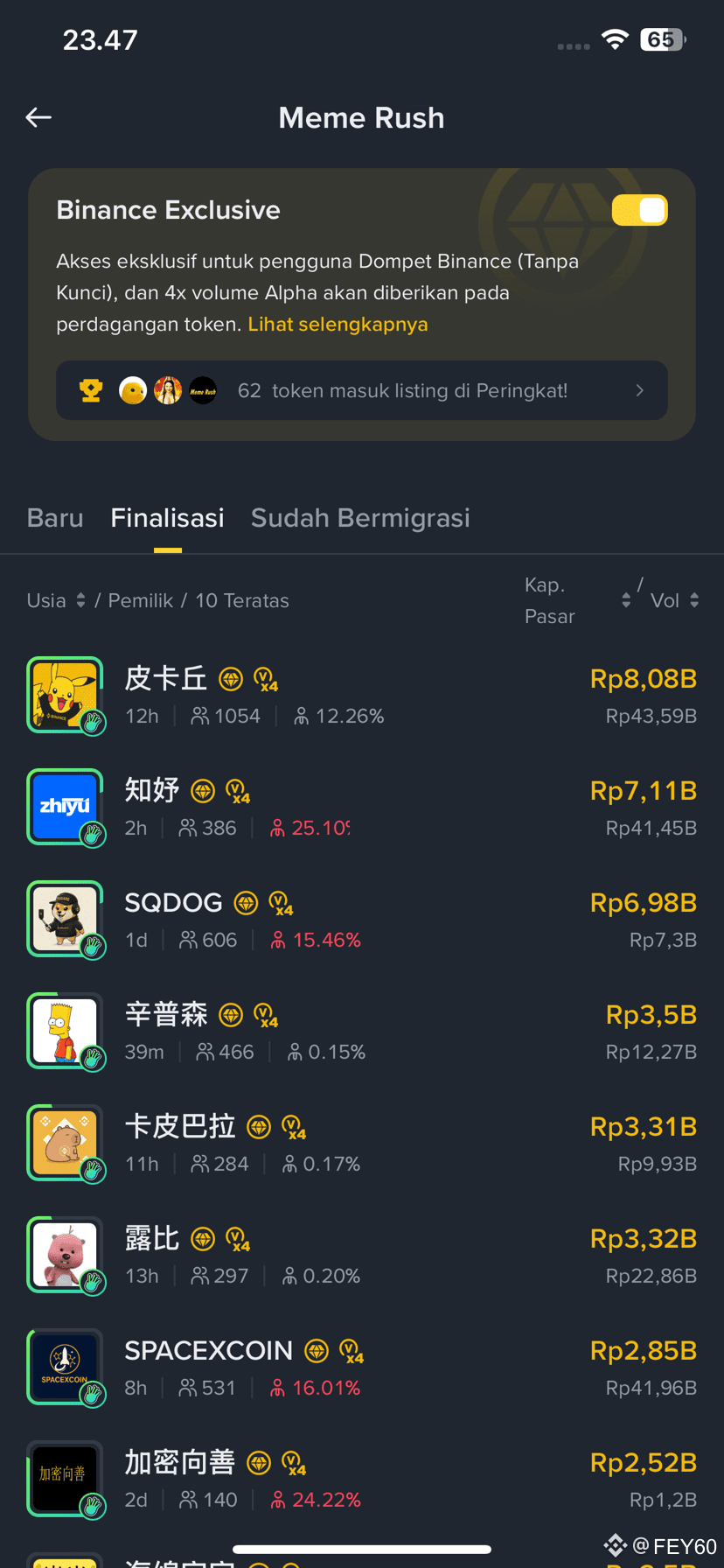 Yang bikin menarik, setiap token yang perform di Meme Rush punya peluang naik level ke Binance Alpha. Alias jadi proyek yang bisa diperdagangkan secara lebih luas di ekosistem Binance.