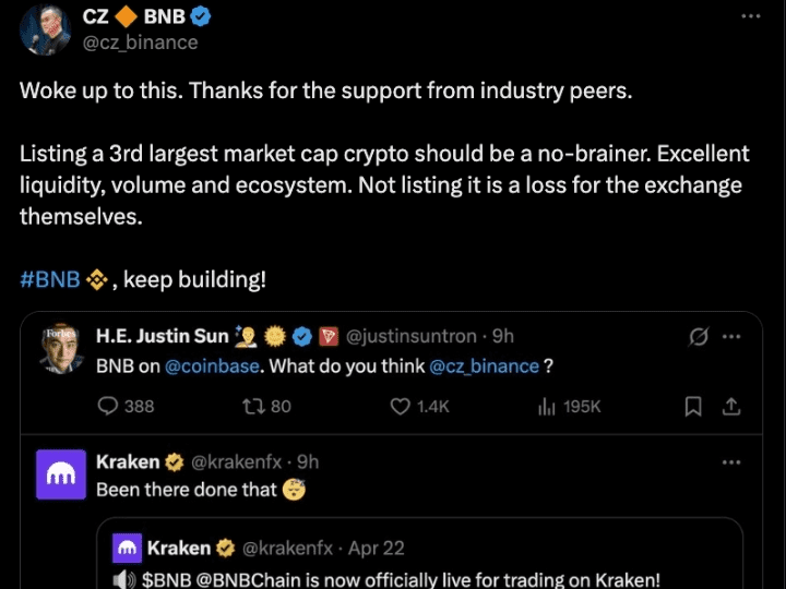 Baik dipengaruhi oleh perdebatan di media sosial atau tidak, Coinbase pada hari Rabu memutuskan untuk menambahkan BNB ke dalam rencana pengembangannya, menunjukkan niat untuk melakukan listing token tersebut. Mantan CEO Binance, Changpeng 'CZ' Zhao, memuji langkah ini, tetapi kemudian juga mendorong Coinbase untuk 'meng-list lebih banyak proyek dari BNB Chain'