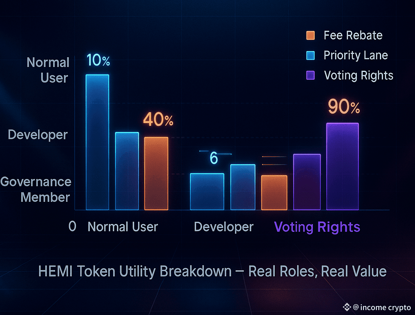 @Hemi का utility-matrix मूलतः तीन रोल्स पर केन्द्रित है, सामान्य उपयोगकर्ता जिन्हें होल्डिंग से फीस-रिबेट और प्राथमिकता मिलती है; डेवलपर्स तथा LPs जिन्हें ग्रांट्स और इंसेंटिव से निर्माण व तरलता-समर्थन मिलता है; और गवर्नेंस सदस्य जिन्हें प्रस्ताव लाने और वोट करने का अधिकार मिलता है। इस तरह प्रत्येक भूमिका के लिए टोकन का उपयोग स्पष्ट व लक्षित रखा गया है, जिससे टोकन-इकोसिस्टम समेकित और व्यवहारिक बनता है।