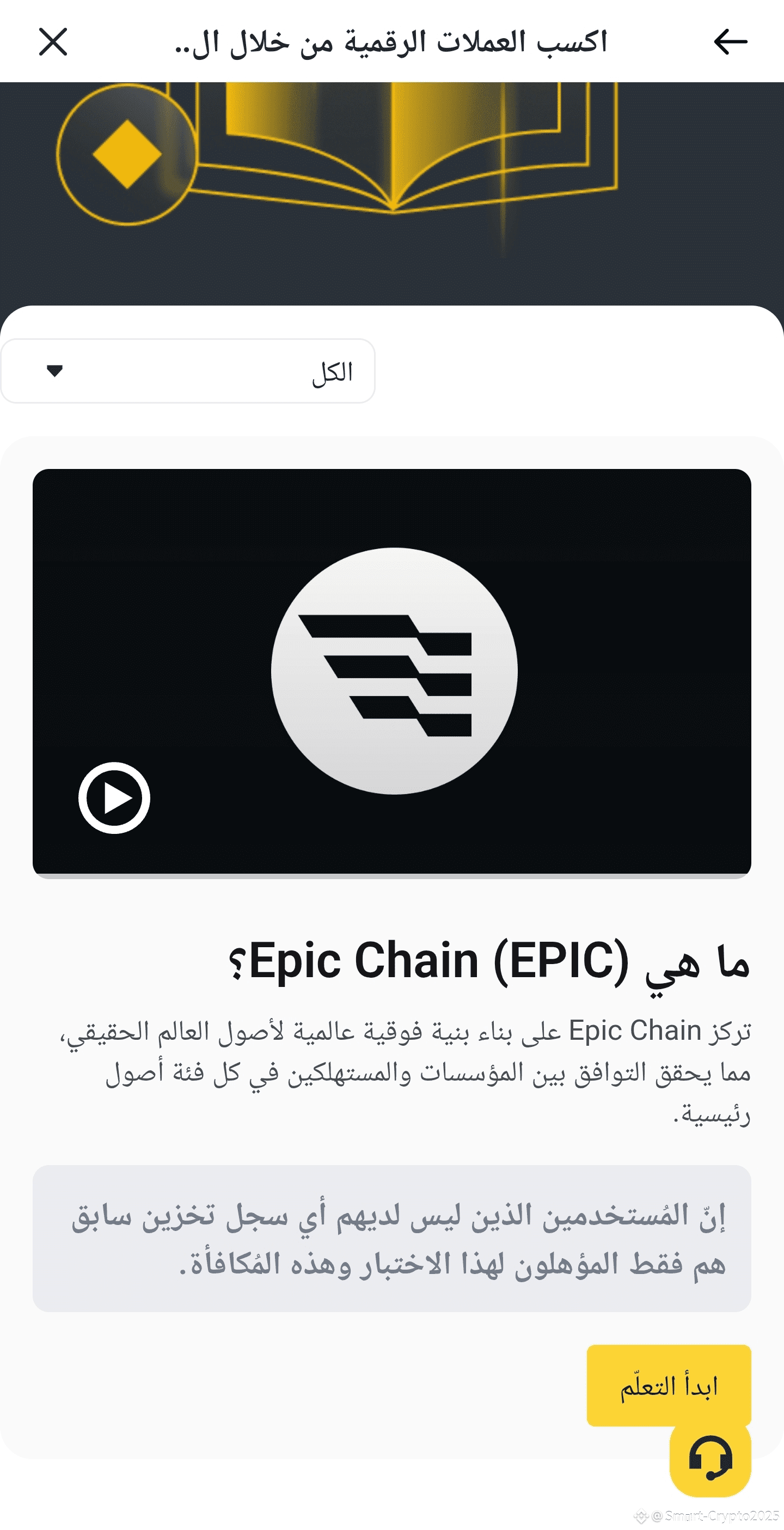 فرص ربح جديدة للمشتركين الجدد او الذين ليس لديهم اي تخزين سابق على منصة بينناس ،اطلقت المنصة برنامج تعليمي جديد عن EPIC CHAIN ،لا تفوت الفرصة واذهب الى ايقونة تعلم واكسب واجب عن الاسئلة بشكل صحيح واحصل على الارباح .