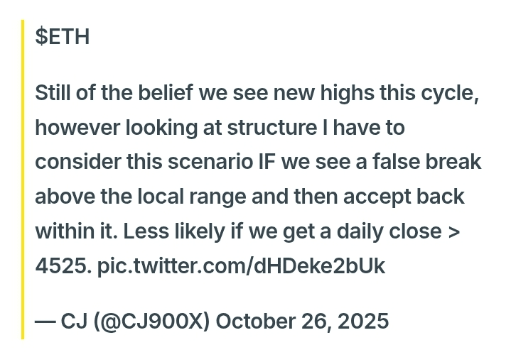 CJ, komentator kripto populer lainnya di X, menunjukkan optimisme bahwa ETH akan mencapai puncak baru, yaitu di atas 5.000 dolar pada siklus ini, tetapi memperingatkan tentang kemungkinan penembusan palsu jika tidak ada penutupan harian di atas 4.525 dolar.