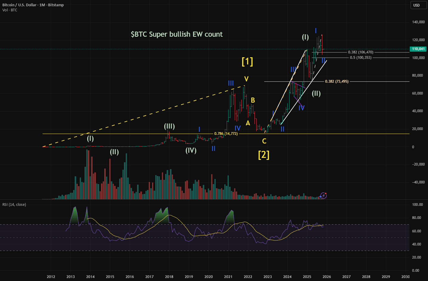 Melihat grafik bulanan, saya melihat tiga puncak siklus sebelumnya sebagai Gelombang (I), (III), dan (V), yang menyelesaikan gelombang primer [I].