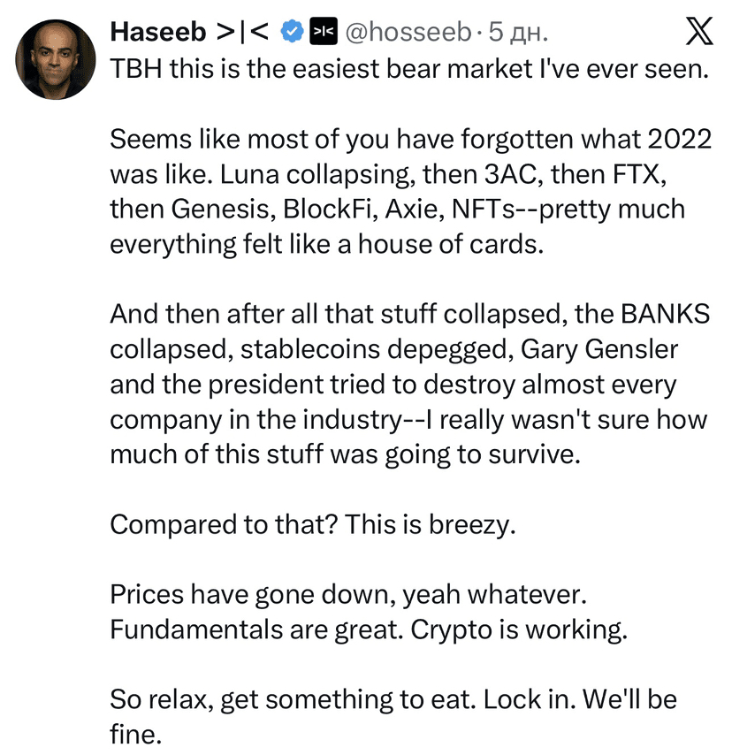 Menurut kata Hasib (managing partner Dragonfly), gelombang penjualan saat ini di pasar kripto berbeda dari 'bear market ekstrem' tahun 2022 — saat itu penurunan disertai dengan keruntuhan Luna, 3AC, FTX, Genesis, dan masalah dalam infrastruktur perbankan. Hasib menekankan: