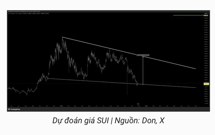Dalam setahun terakhir, aksi harga SUI telah membentuk pola wedge menurun yang lebar, dengan puncak yang semakin rendah mencerminkan tekanan jual yang terus berlanjut. Namun, garis batas bawah dari pola tetap kokoh, menunjukkan bahwa kekuatan beli diam-diam melindungi area ini.