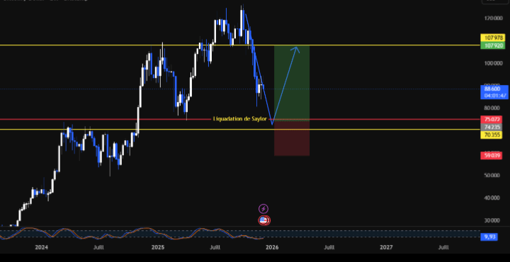 Le Bitcoin consolide. Les bears s'agitent. Et un chiffre revient sans cesse dans les discussions : 74 000 $.