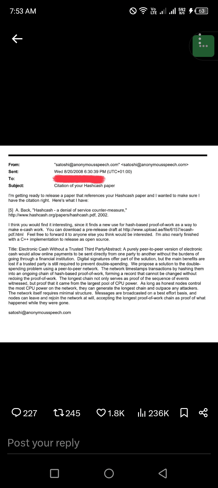 Transaksi pertama dari Satoshi pergi kepadanya.
