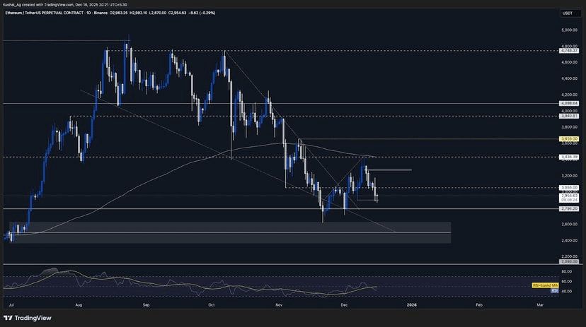 ETH is now trading around the mid-range, between $3,055 (range high) and $2,794 (range low), while wicking below the December 7 swing low, indicating active liquidity sweeps rather than clean continuation to the downside.