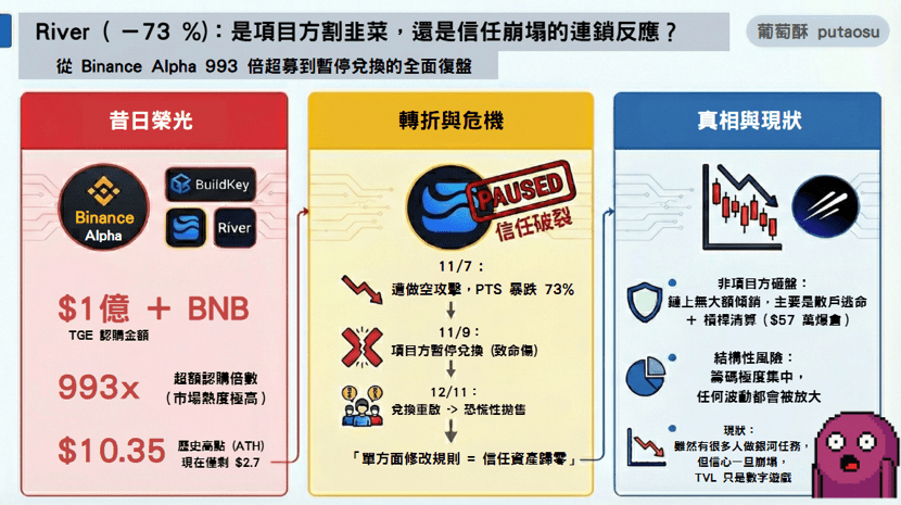 Hingga saat penulisan, harga masih mengalami fluktuasi besar, harga terendah mencapai sekitar 1,6, selain masalah kepercayaan, pasar yang buruk juga membuat semua orang ingin segera menukar Pts menjadi $RIVER lalu menjualnya