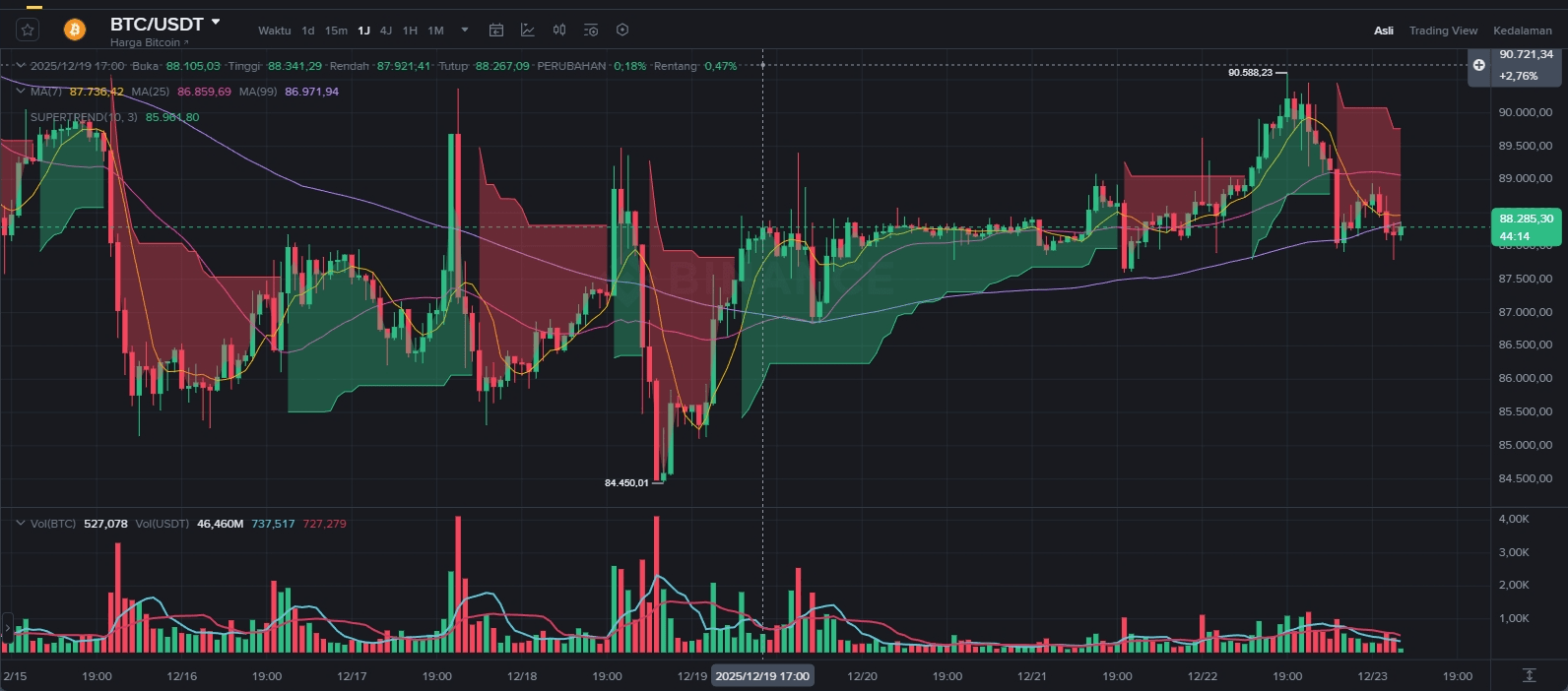 Bitcoin menghadapi ujian kritis pada akhir 2025. Level resistensi $90.000 terbukti menjadi penghalang psikologis dan teknis. Empat upaya breakout di bulan Desember berakhir dengan penolakan, menandakan melemahnya momentum bullish. Harga sempat menyentuh $90.500 sebelum jatuh ke $88.000, dengan volume pembelian lebih lemah dibandingkan tekanan penjualan. Ini meningkatkan risiko koreksi menuju zona support $83K–$85K, meskipun short squeeze menuju $95K tetap mungkin jika Bitcoin ditutup di atas $90.500.