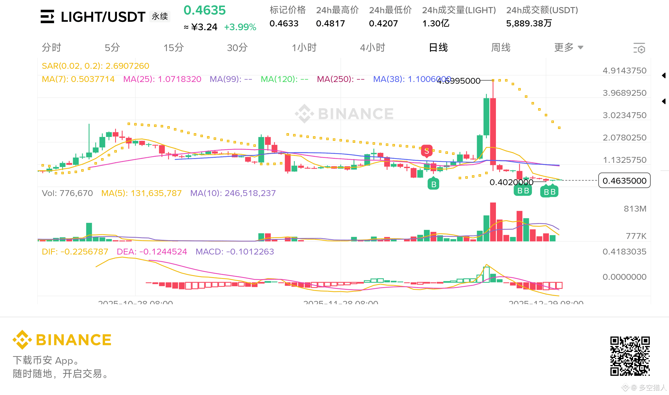 Bitlight 当前的价格为 0.4485 美元,相较于历史高点已经出现了显著的回调。这种超跌状态,既可能是市场情绪的过度反应,也可能是主力在“洗盘”过程中故意制造的恐慌。