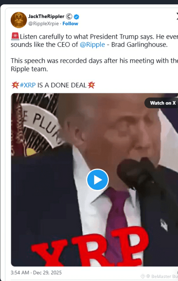 Dia membagikan pandangan ini setelah mengunggah video Presiden Donald Trump yang berbicara tentang crypto dan masa depan infrastruktur keuangan. JackTheRippler mengaitkan komentar Trump dengan waktunya, mencatat bahwa pidato itu terjadi pada bulan Juli—hanya beberapa hari setelah Trump bertemu dengan tim Ripple.