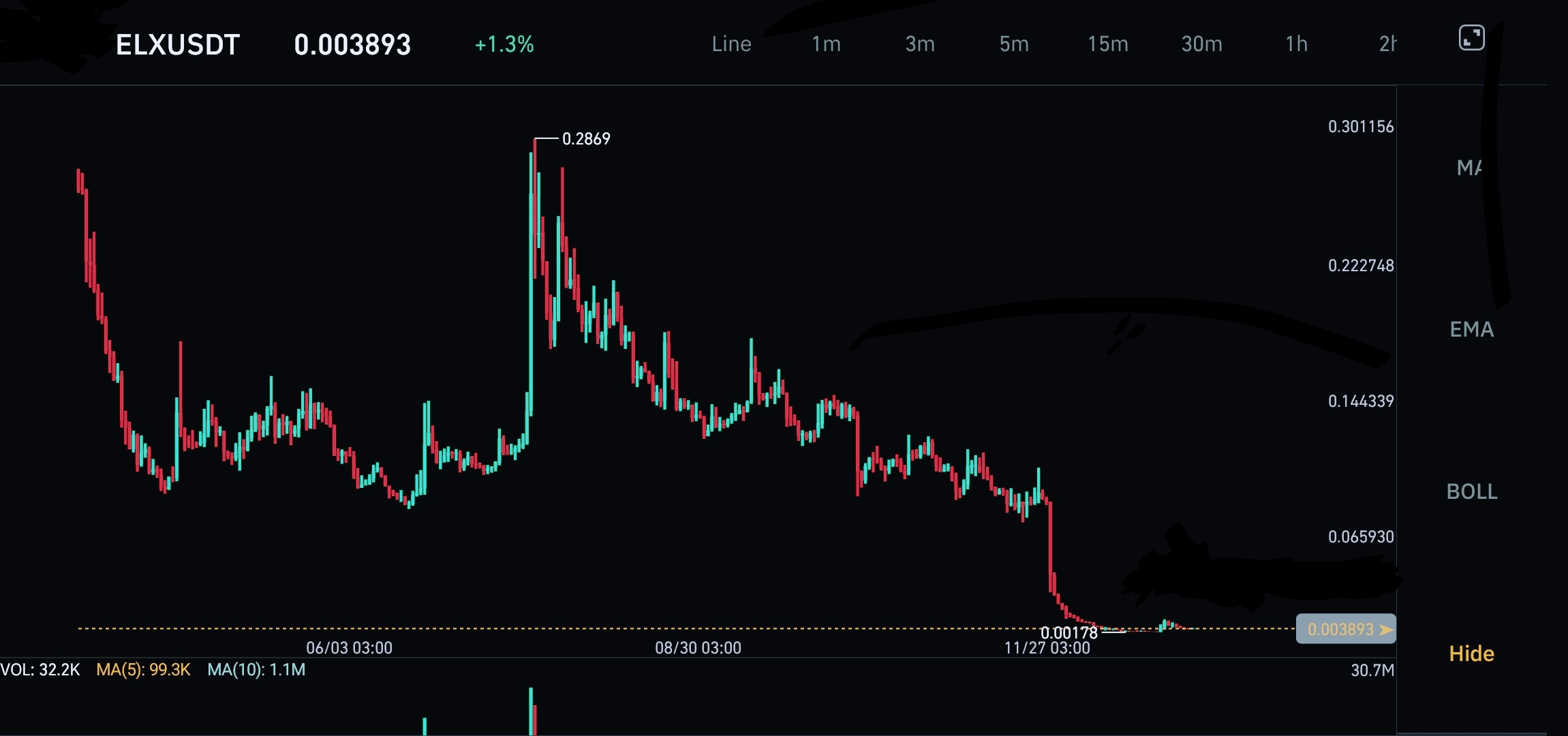 Kinerja token selaras dengan koreksi pasar kripto secara umum, tetapi diperparah oleh risiko khusus ELX (misalnya, tidak ada pasokan yang beredar, adopsi belum terbukti).